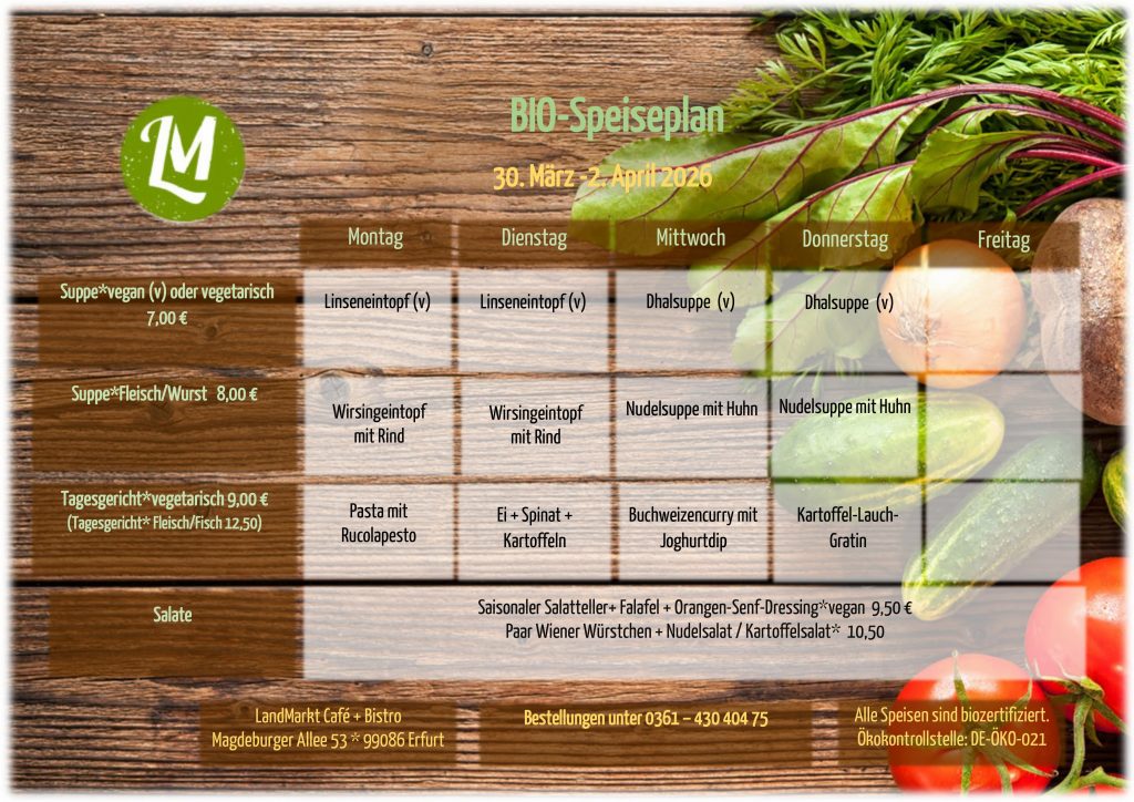 Seit Oktober 2013 kochen wir im schönen Erfurter Norden mit Leidenschaft. Dabei verwenden wir ausschließlich ökologisch erzeugte Lebensmitteln. Unser Mittagessen ist gesund und preiswert. Wir bieten auch vegane und vegetarische Speisen an.