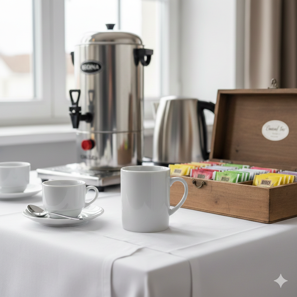 Fair-Trade-Kaffee, Tee in vielen Sorten, Milch, Milchersatz, Zucker